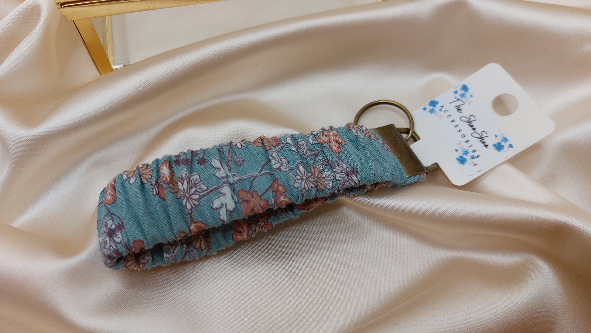 Nyckelband med brett elastiskt band dekorerat med vackert tyg från lokala tygbutiker. Det är så praktiskt att ha dina nycklar på handleden när du behöver ha båda händerna fria. Bandet trillar inte av eftersom det har ett rejält elastiskt band som sitter bekvämt. Perfekt när du ska öppna dörren med händerna fulla.