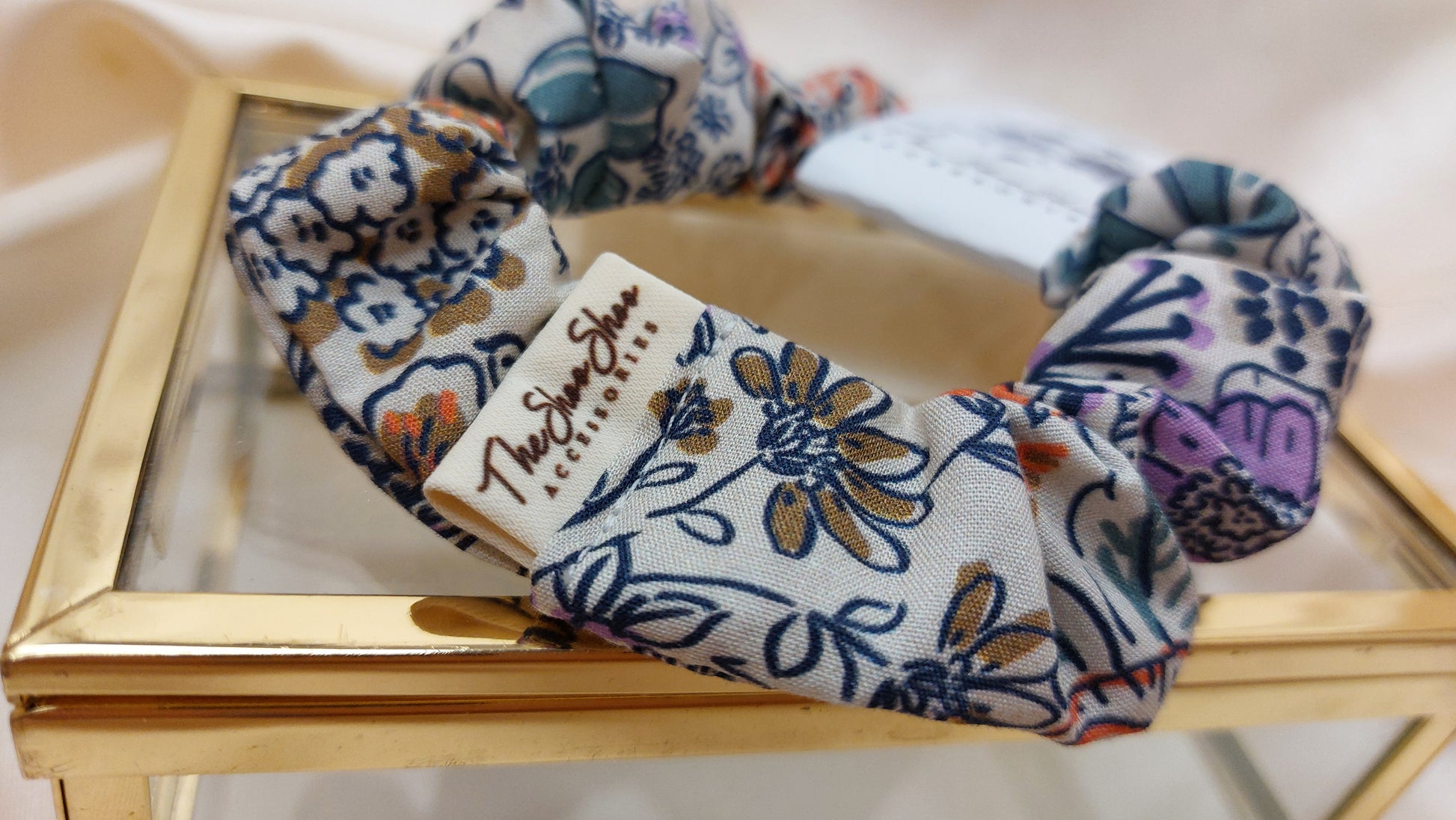 The Shoo Shoo hair tie of woven beautiful fabric in grey, and some light blue and green. Soft, slightly thicker, high quality fabric from local fabric stores. Suitable for everyone from thick to thin hair.