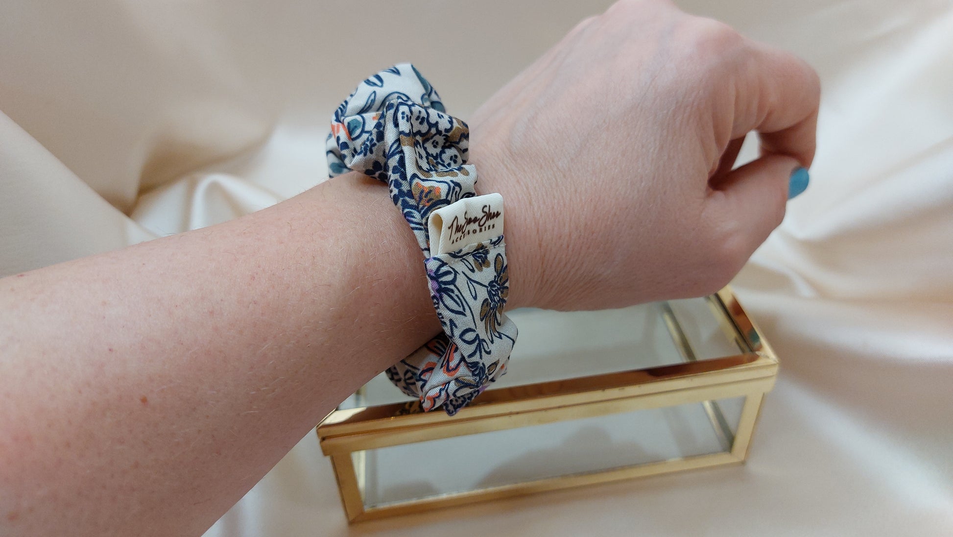 All Shoo Shoo scrunchies are cut and sewn by hand. The flat elastic rubber band inside has been tied by hand. The fit of the ShooShoo scrunchie's rubber band is made larger than on regular scrunchies to fit better on the wrist without tightening, but also to hold all types of hair better, Durable hair tie with 5 year warranty.