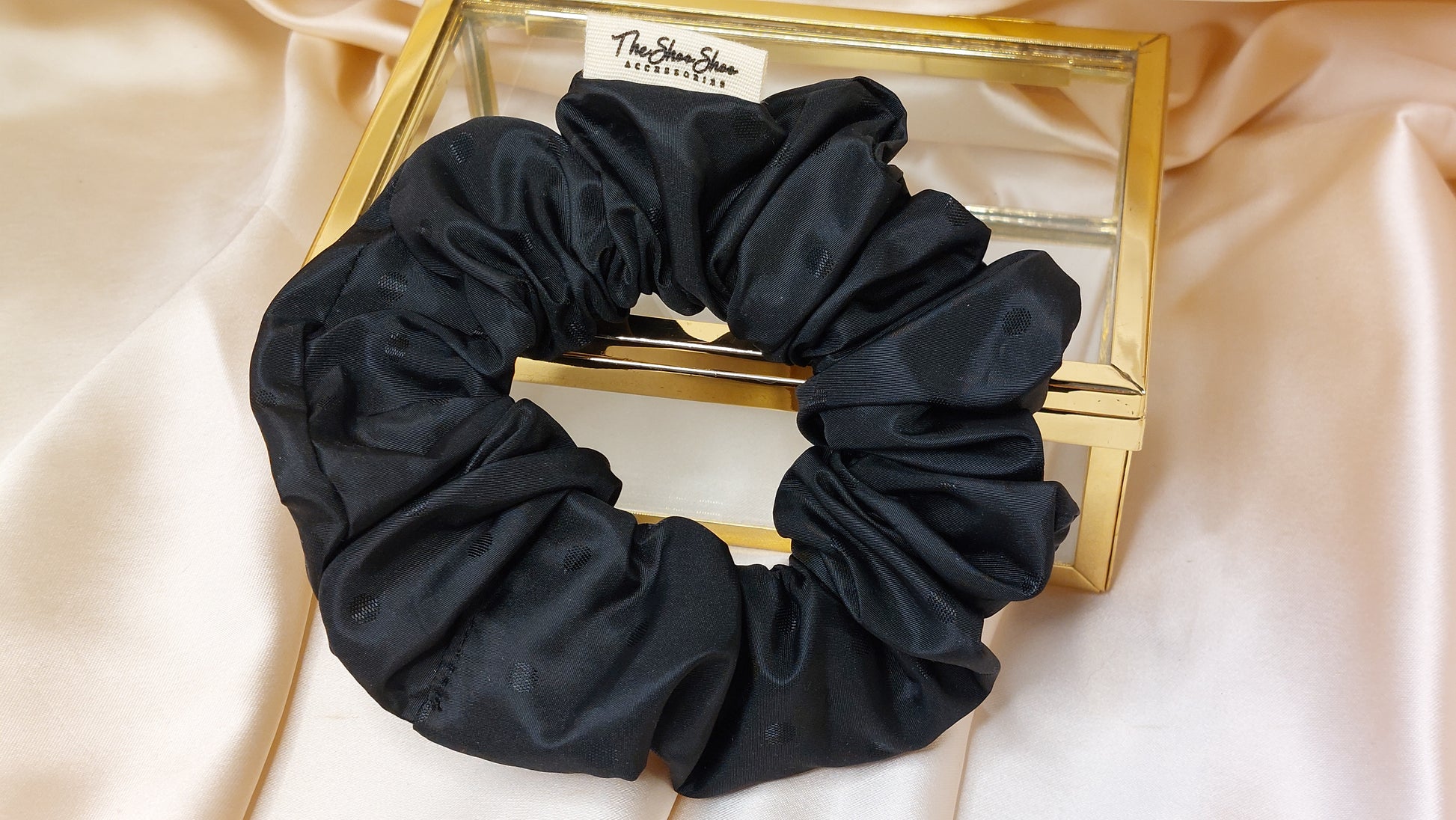 The Shoo Shoo hair tie made of lovely crisp fabric called taffeta. It has a nice shimmer and sewn-in black shiny dots. High quality soft firmer fabric sourced from local fabric stores. Suitable for everyone from thick to thin hair.