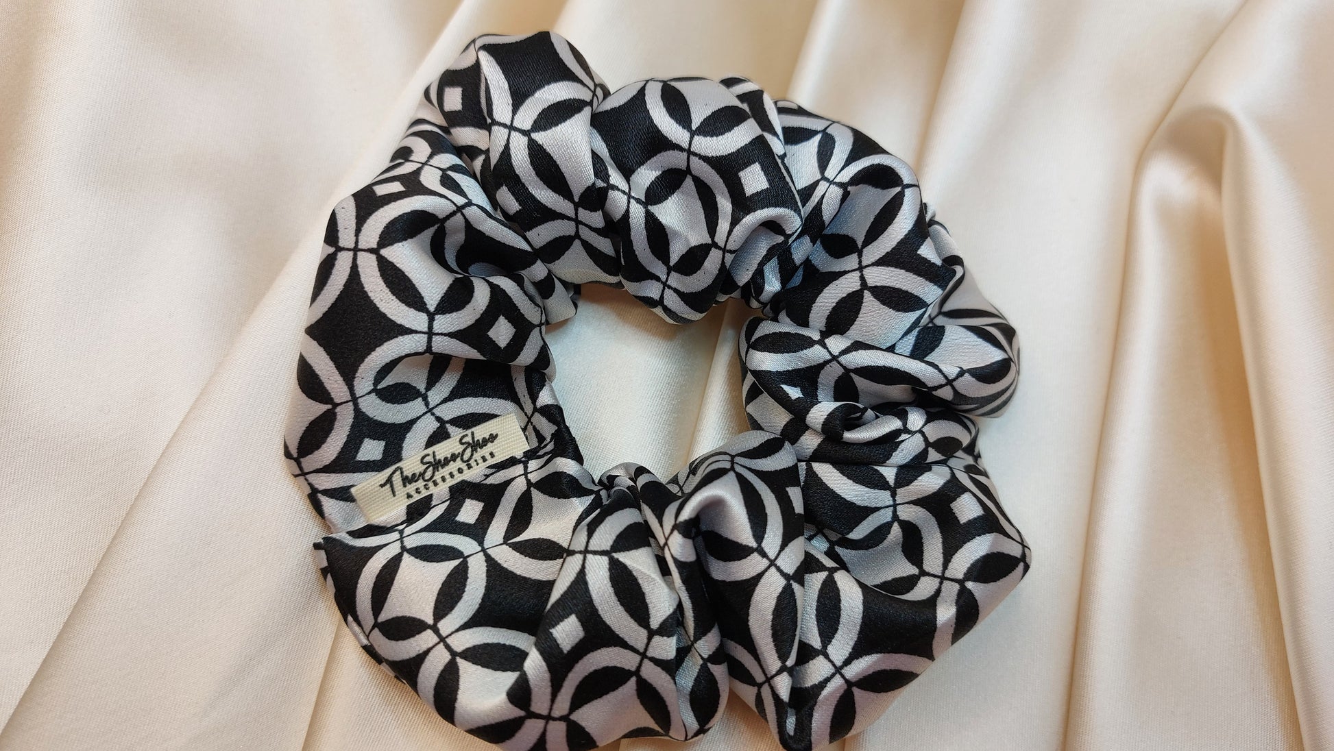 Black and White Geo ShooShoo Satin Scrunchie - Handgjord