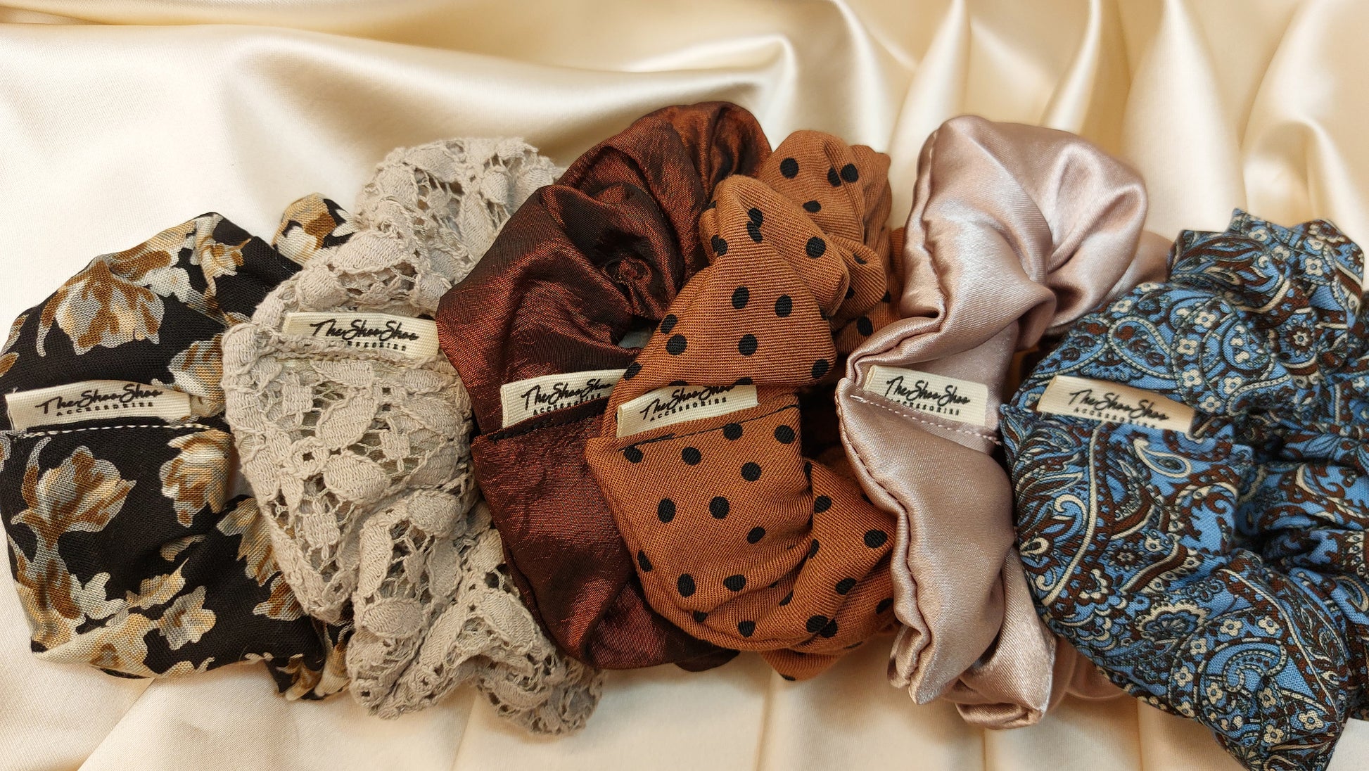 Alla Shoo Shoo scrunchies är klippta och sydda för hand. Det platta elastiska gummibandet inuti har knutits för hand. Passformen på ShooShoo-scrunchies gummiband görs större än på vanliga scrunchies för att passa bättre på handleden utan att strama åt, men också för att hålla alla sorters hår bättre.