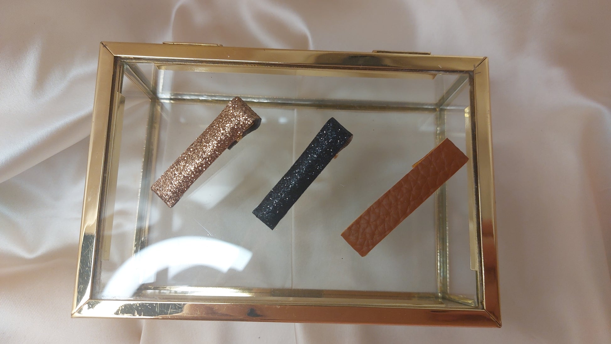The Shoo Shoo hårklämmor gör det enkelt att sätta upp lugg eller hålla fast håret. Perfekt att sätta upp mindre hårdtestar eller flätor med. Handgjorda med dekor av band och fuskläder på ovansidan. Enkla att sätta fast och ta av. Härligt glittriga och eleganta klämmor passar fint till både vardag och fest. Passar till alla från tjockt till tunt hår. Cirka 50mm långa.
