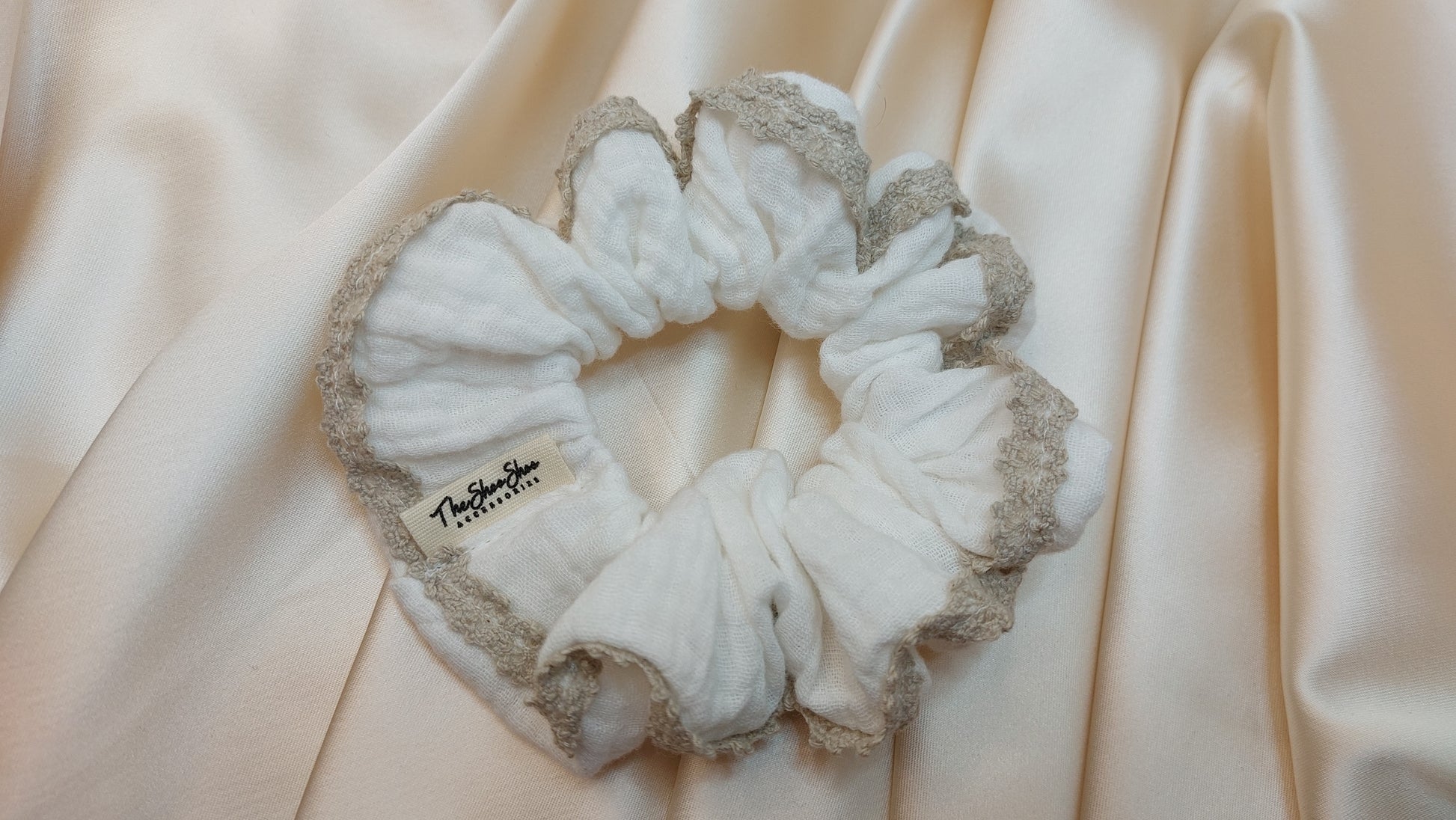 The Shoo Shoo vit hårsnodd av strukturerad bomull med beige påsydd spets runt om. Mjukt tyg av hög kvalitet inhandlat från lokala tygbutiker. Passar till alla från tjockt till tunt hår.