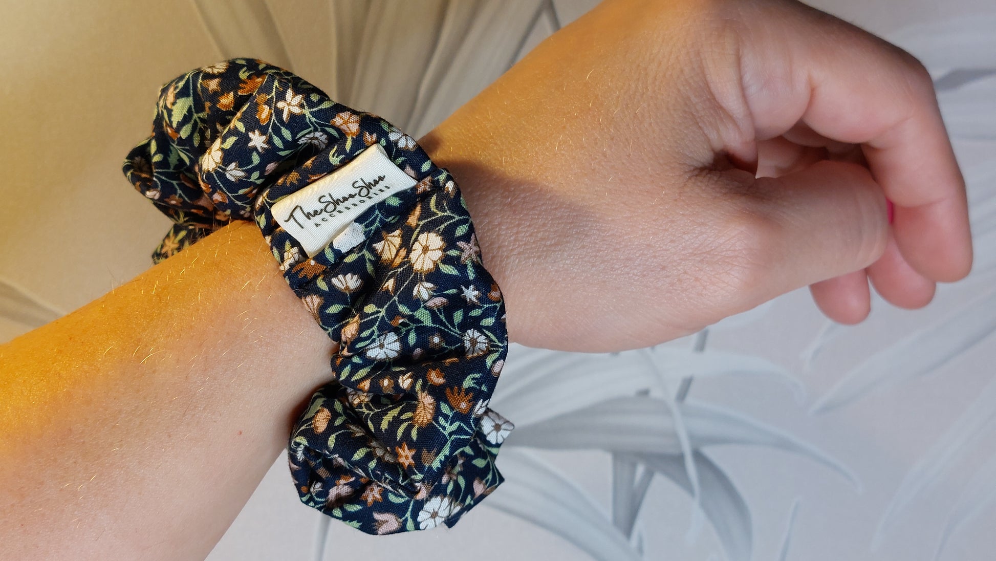 Alla Shoo Shoo scrunchies är klippta och sydda för hand. Det platta elastiska gummibandet inuti har knutits för hand. Passformen på ShooShoo-scrunchies gummiband görs större än på vanliga scrunchies för att passa bättre på handleden utan att strama åt, men också för att hålla alla sorters hår bättre.