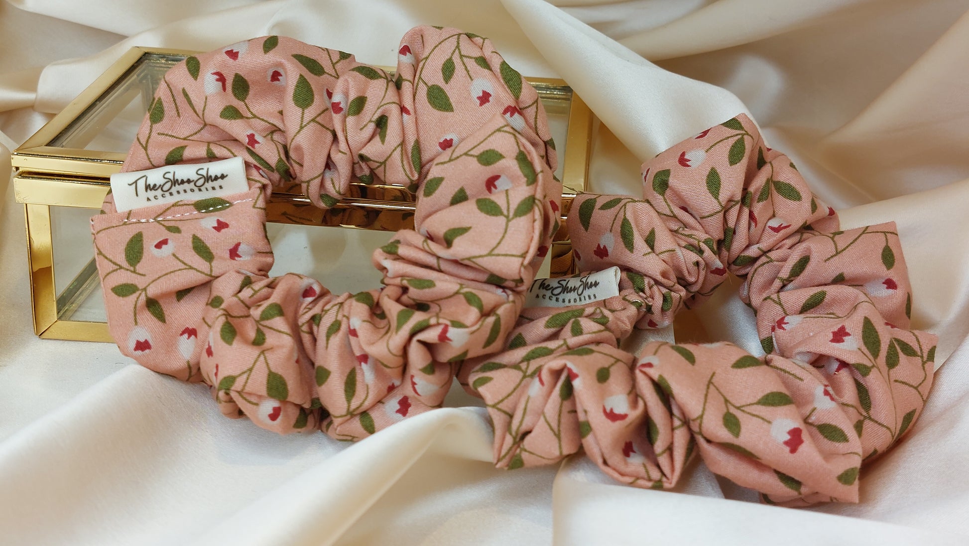 The Shoo Shoo hårsnodd av mönstrad bomull i rosa, grönt, vitt och rött. Mjukt tyg av hög kvalitet inhandlat från lokala tygbutiker. Passar till alla från tjockt till tunt hår.