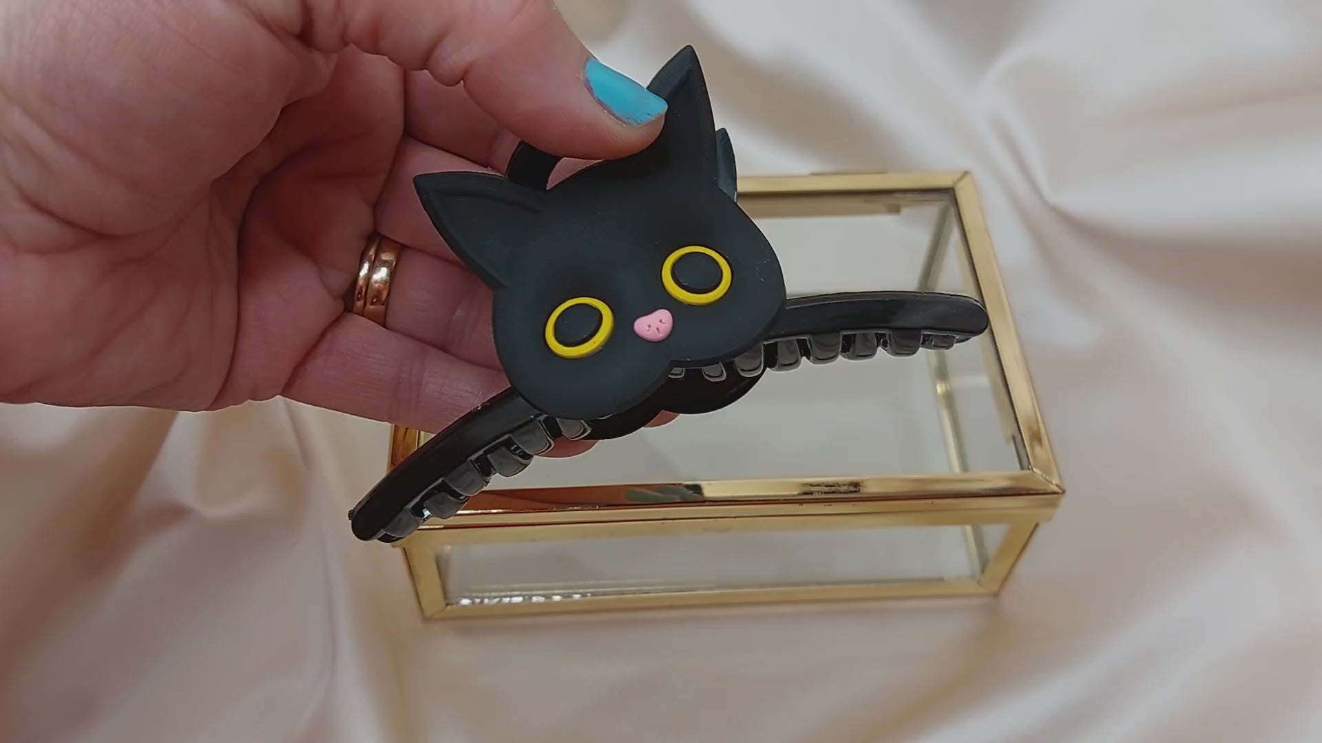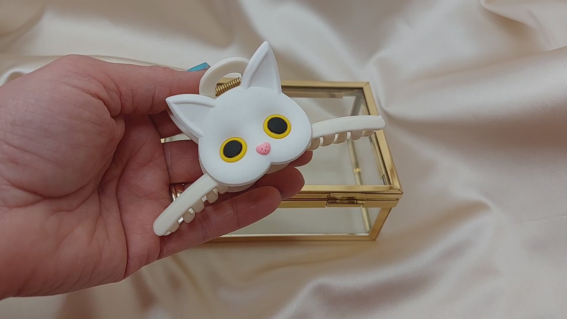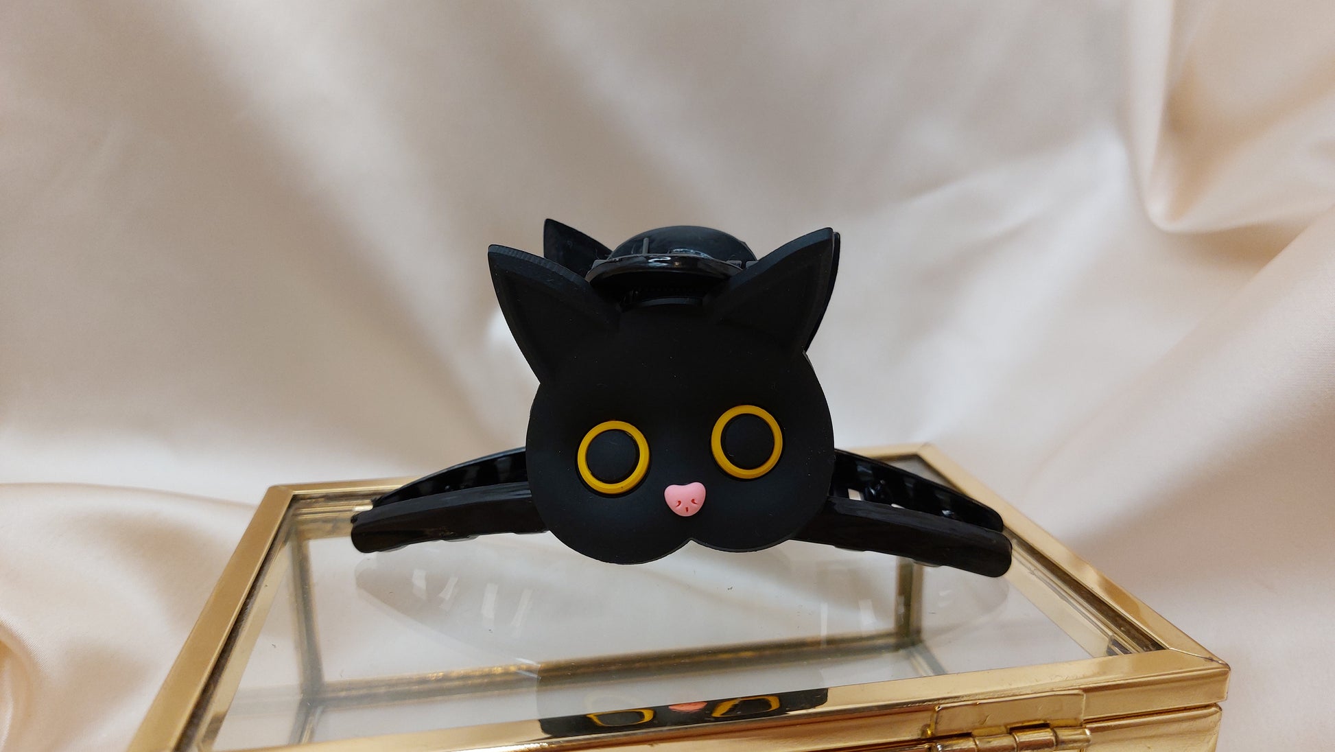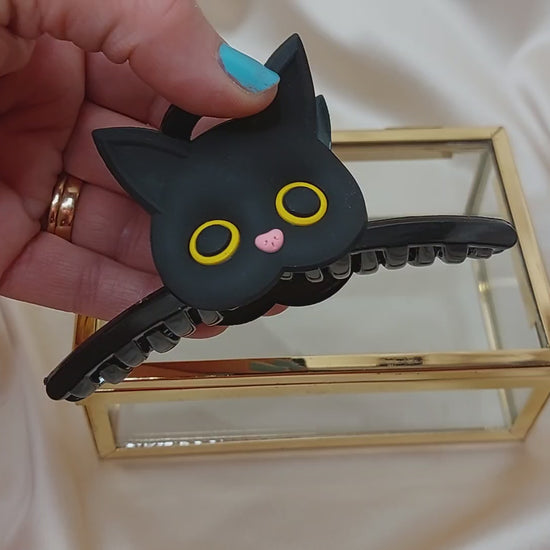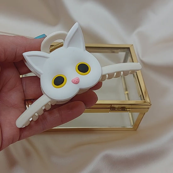 Hårklo med ett supersött katthuvud på varje sida! Katthuvudet är av mjuk silikon och har fina detaljer. Med denna fina hårklo kan du enkelt sätta upp hela eller delar av håret snabbt. Enkel att sätta fast och ta av. Passar till alla från tjockt till tunt hår. Cirka 70mm långa.