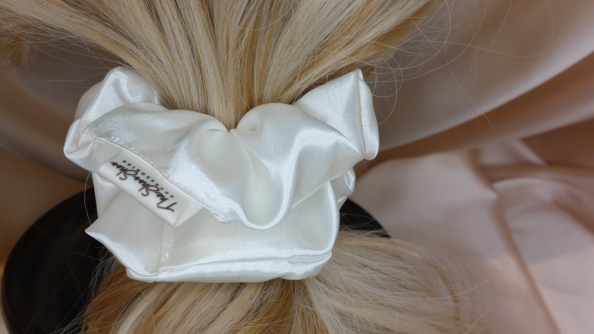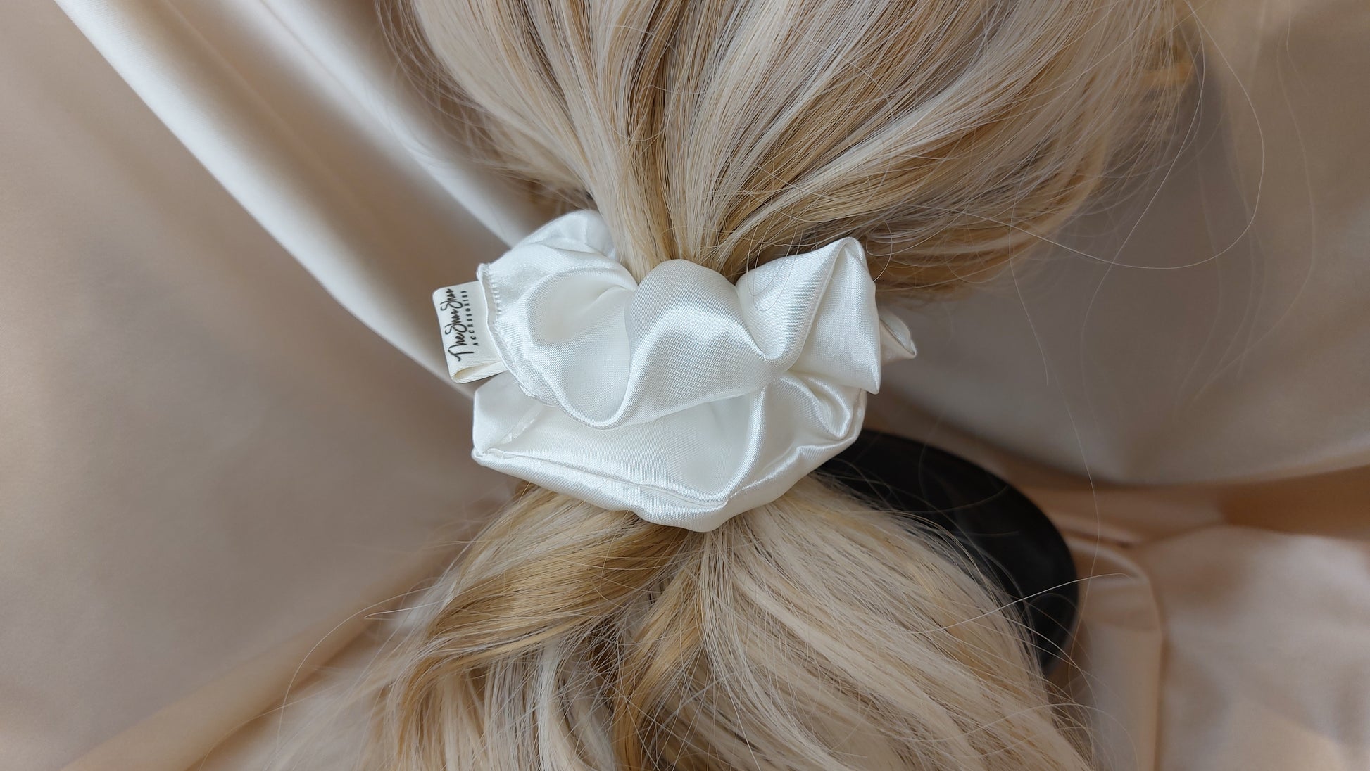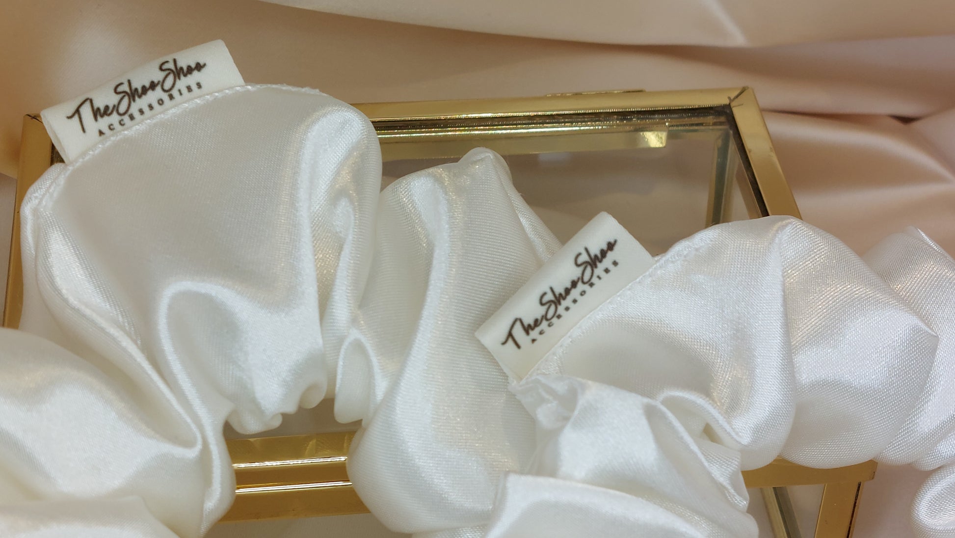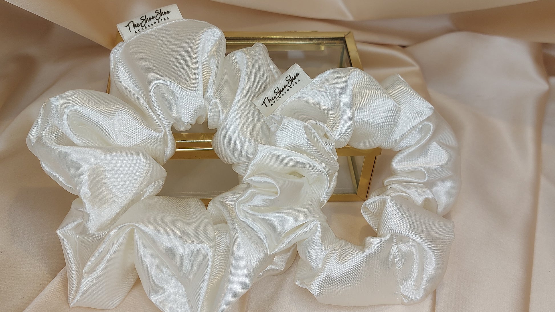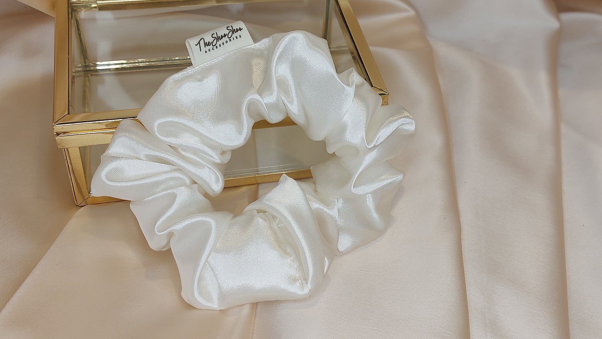 Pure White Shine ShooShoo Satin Scrunchie - Handgjord