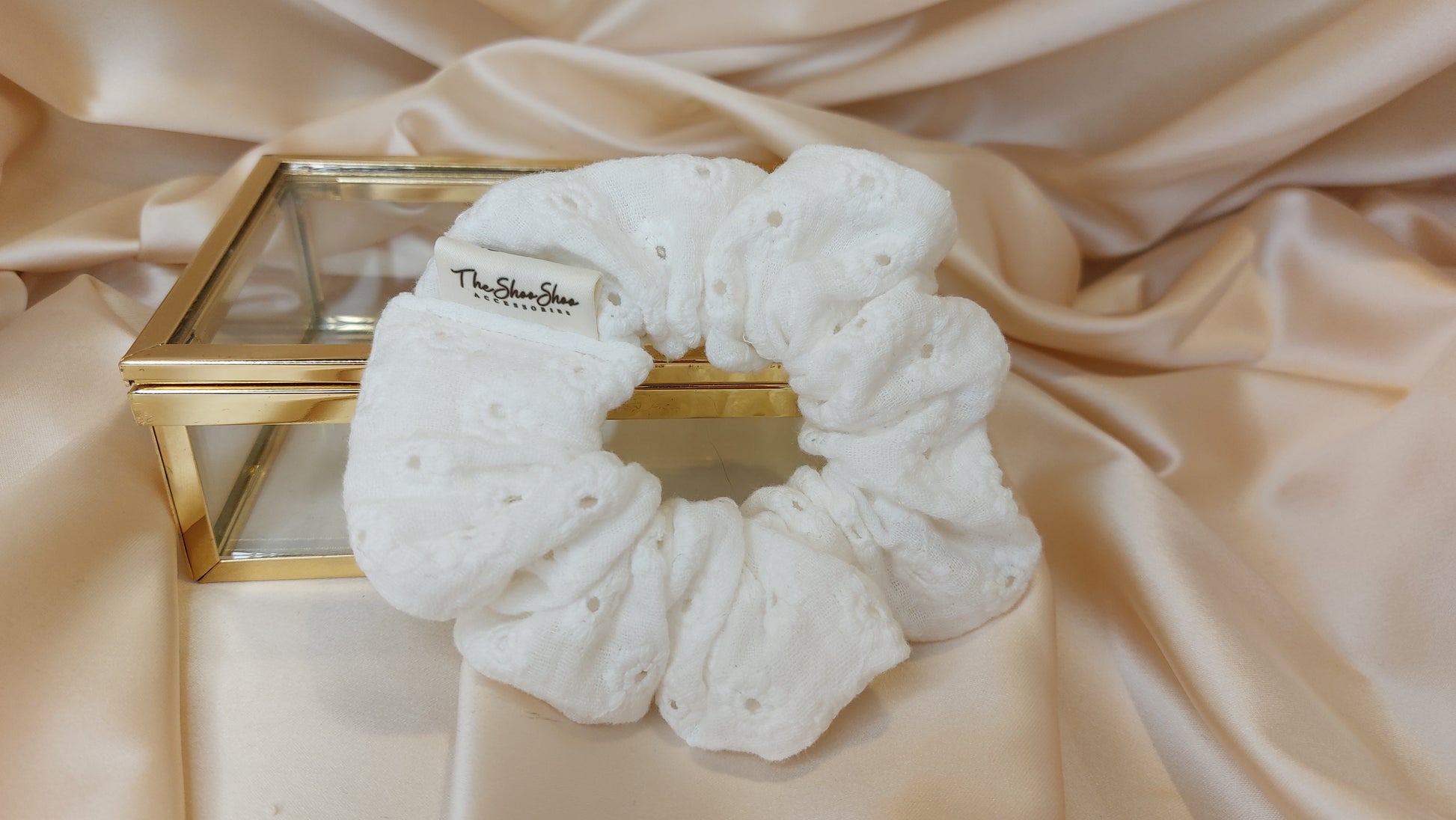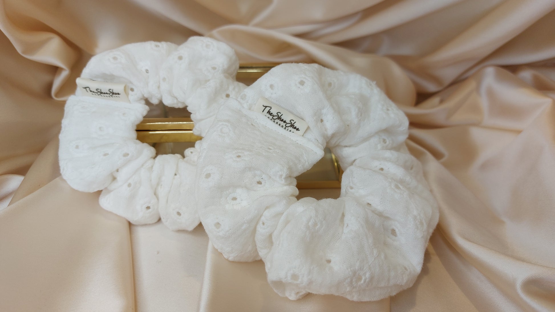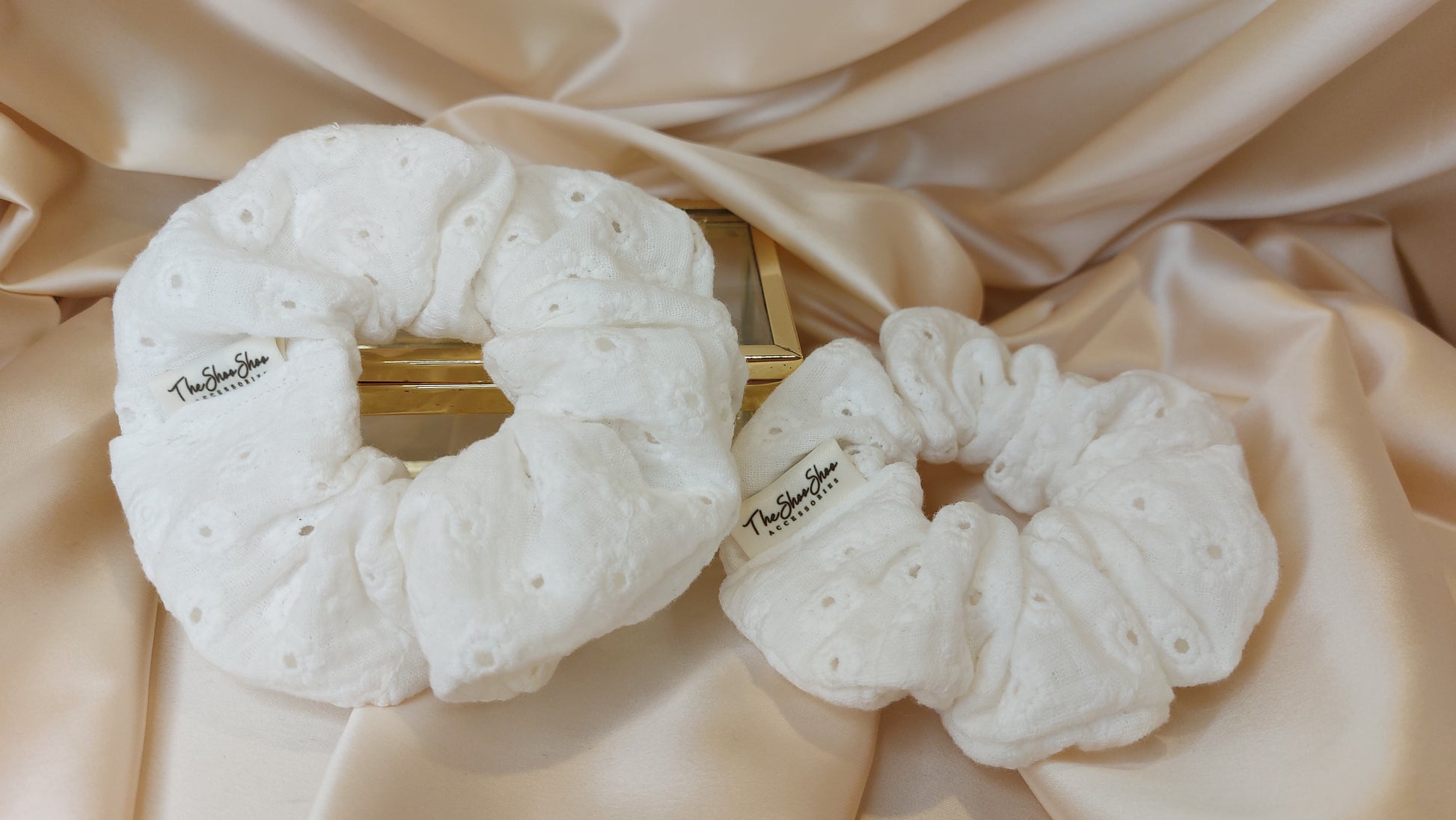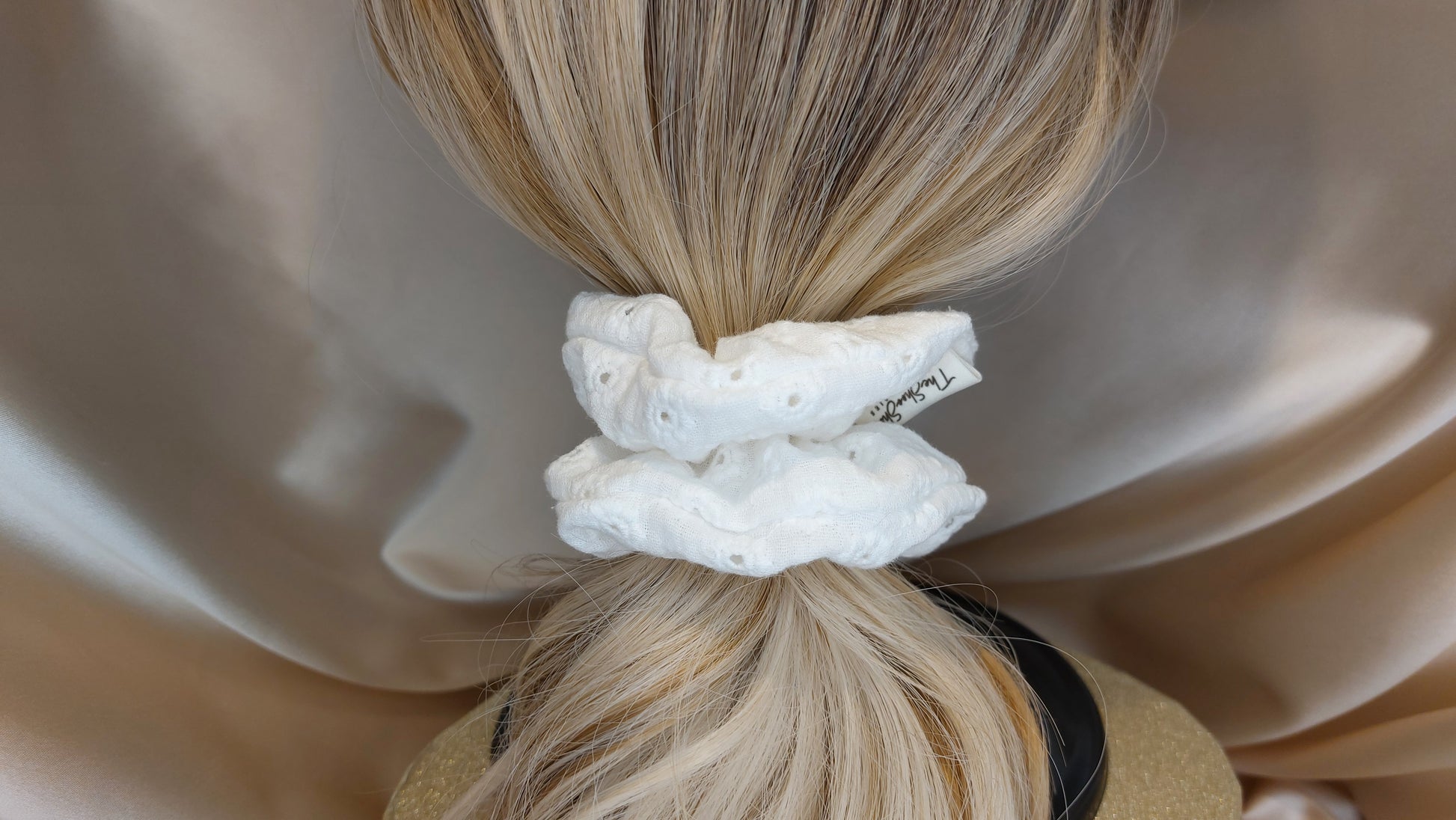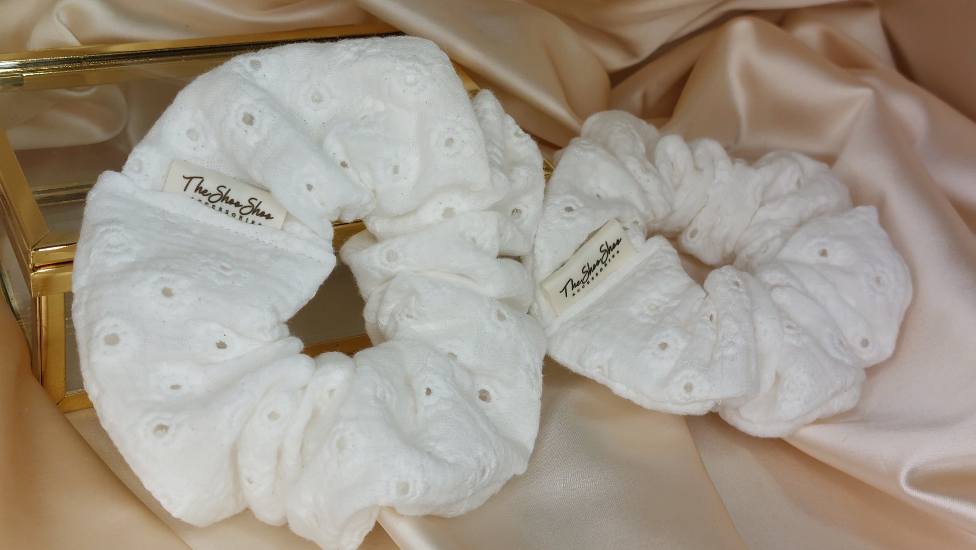 Alla Shoo Shoo scrunchies är klippta och sydda för hand. Det platta elastiska gummibandet inuti har knutits för hand. Passformen på ShooShoo-scrunchies gummiband görs större än på vanliga scrunchies för att passa bättre på handleden utan att strama åt, men också för att hålla alla sorters hår bättre.