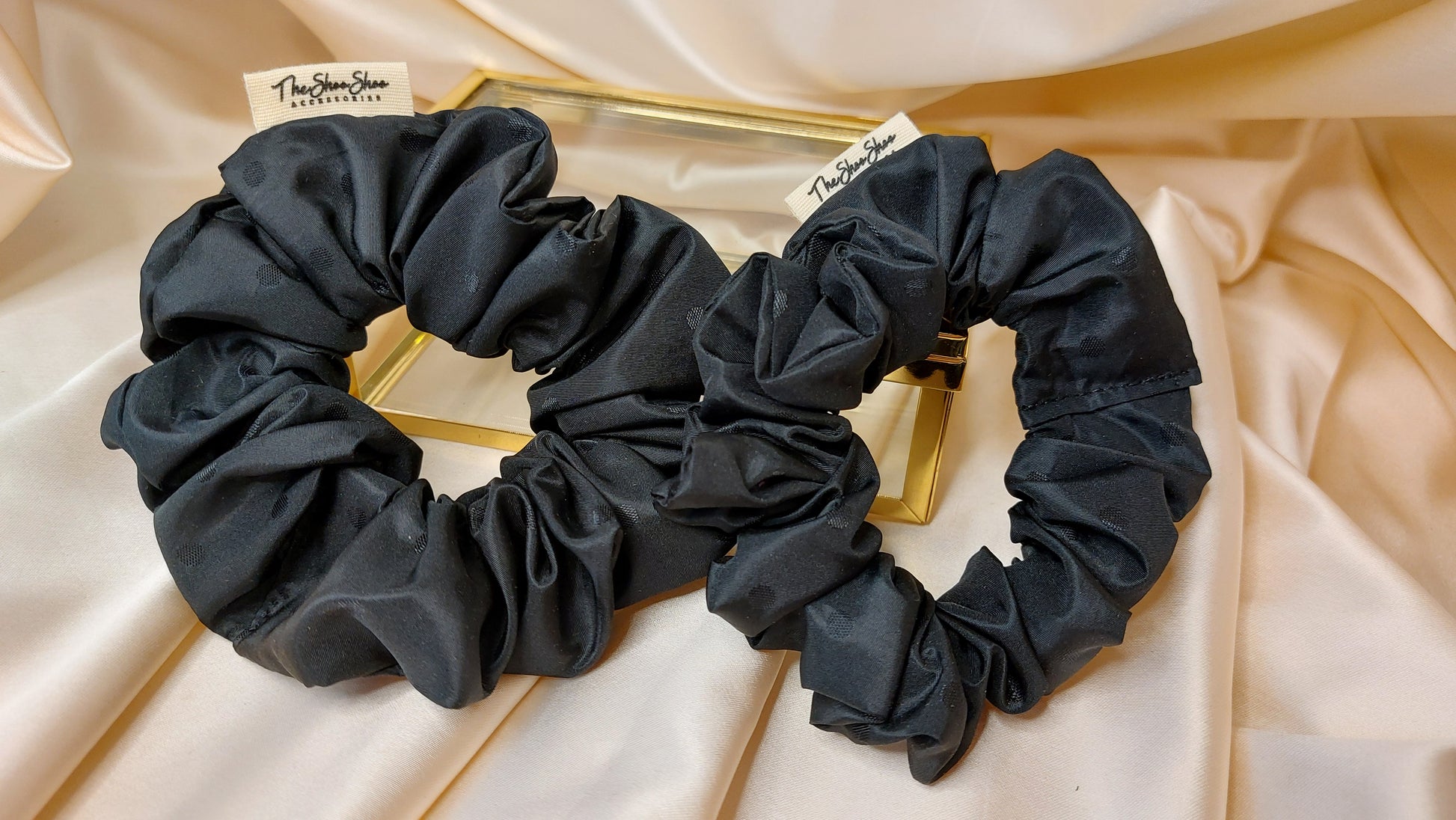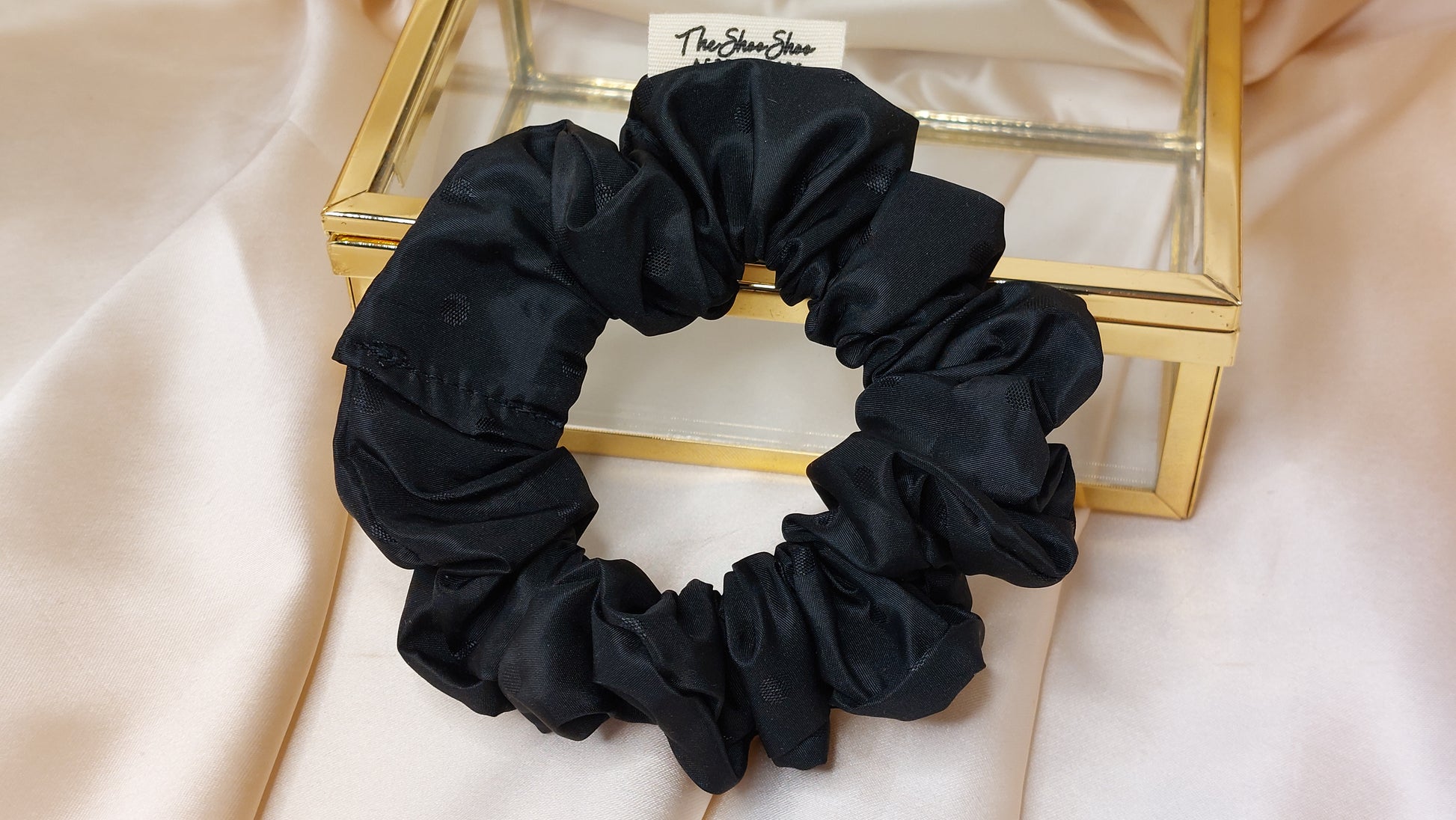 The Shoo Shoo hårsnodd av härligt frasigt tyg som kallas taft. Det har ett fint skimmer och insydda svarta glänsande prickar. Mjukt stadigare tyg av hög kvalitet inhandlat från lokala tygbutiker. Passar till alla från tjockt till tunt hår.