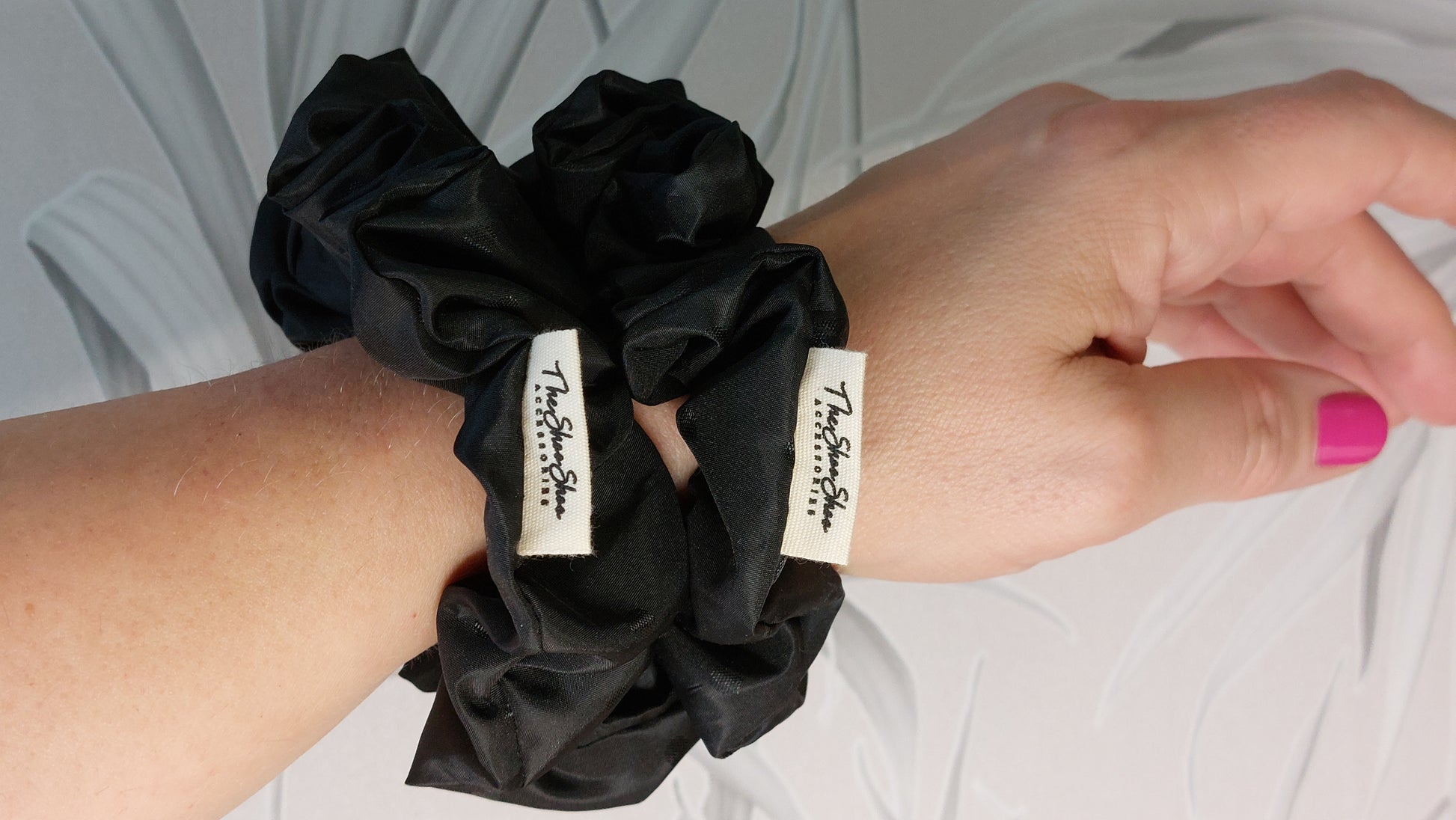 Alla Shoo Shoo scrunchies är klippta och sydda för hand. Det platta elastiska gummibandet inuti har knutits för hand. Passformen på ShooShoo-scrunchies gummiband görs större än på vanliga scrunchies för att passa bättre på handleden utan att strama åt, men också för att hålla alla sorters hår bättre.
