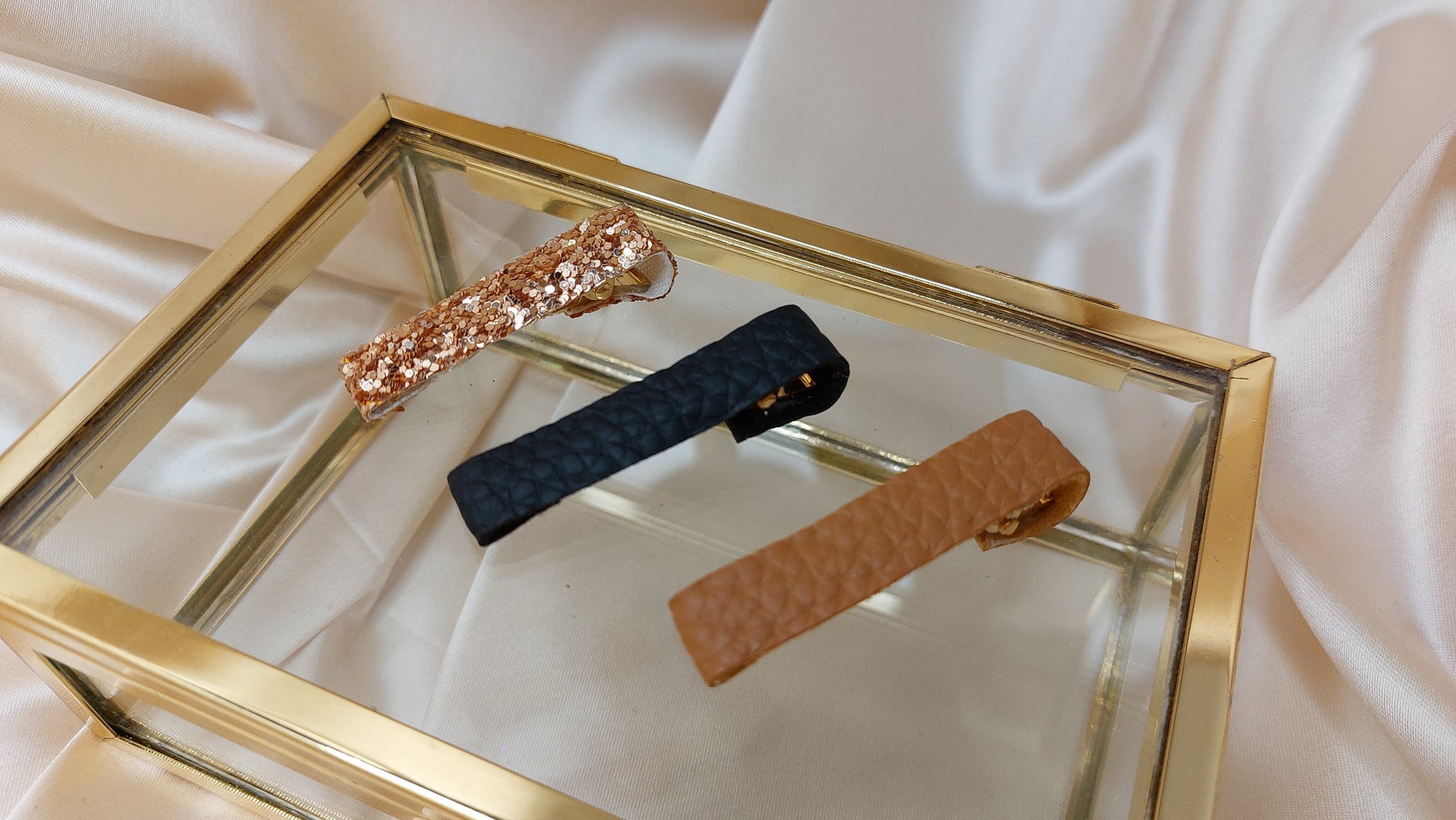 The Shoo Shoo hårklämmor gör det enkelt att sätta upp lugg eller hålla fast håret. Perfekt att sätta upp mindre hårdtestar eller flätor med. Handgjorda med dekor av band och fuskläder på ovansidan. Enkla att sätta fast och ta av. Härligt glittriga och eleganta klämmor passar fint till både vardag och fest. Passar till alla från tjockt till tunt hår. Cirka 50mm långa.