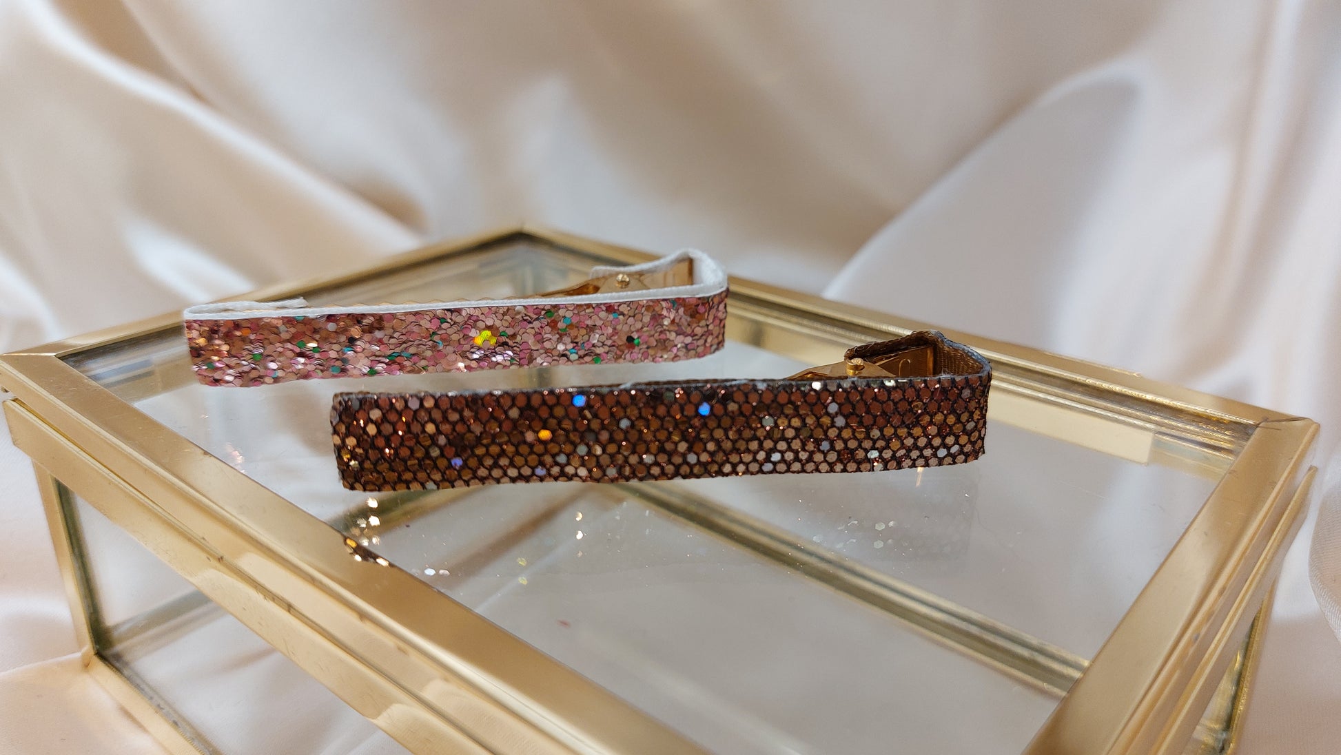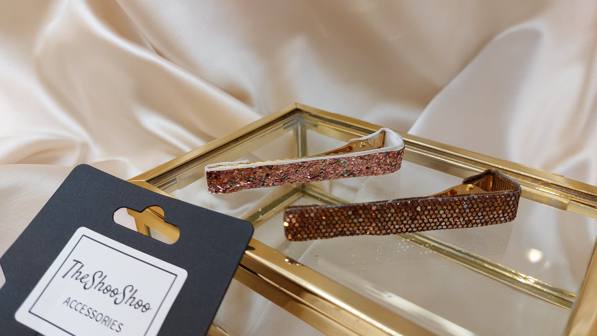 The Shoo Shoo hårklämmor gör det enkelt att sätta upp lugg eller hålla fast håret. Perfekt att sätta upp mindre hårdtestar eller flätor med. Handgjorda med dekor av band och fuskläder på ovansidan. Enkla att sätta fast och ta av. Härligt glittriga och eleganta klämmor passar fint till både vardag och fest. Passar till alla från tjockt till tunt hår. Cirka 70mm långa.