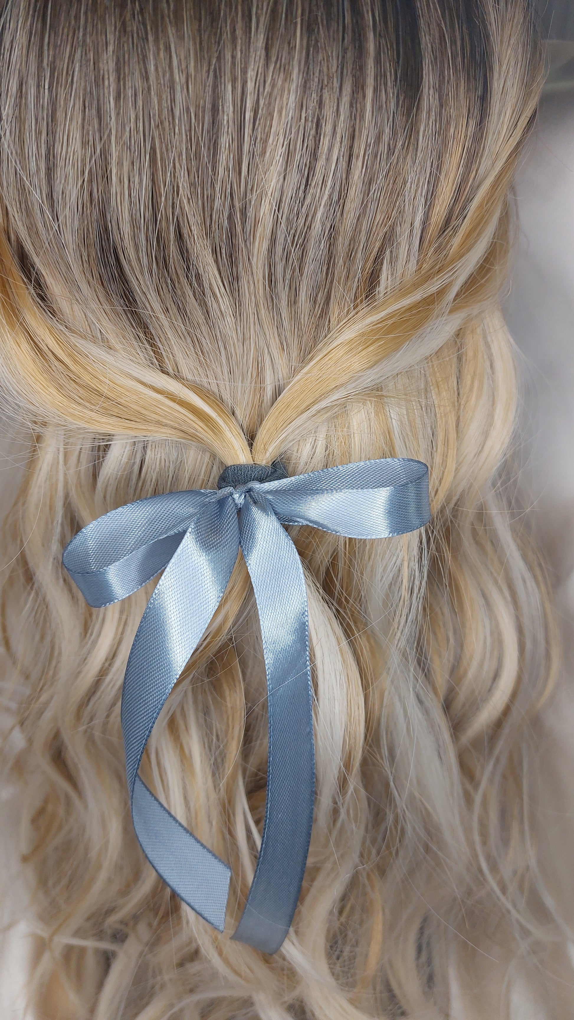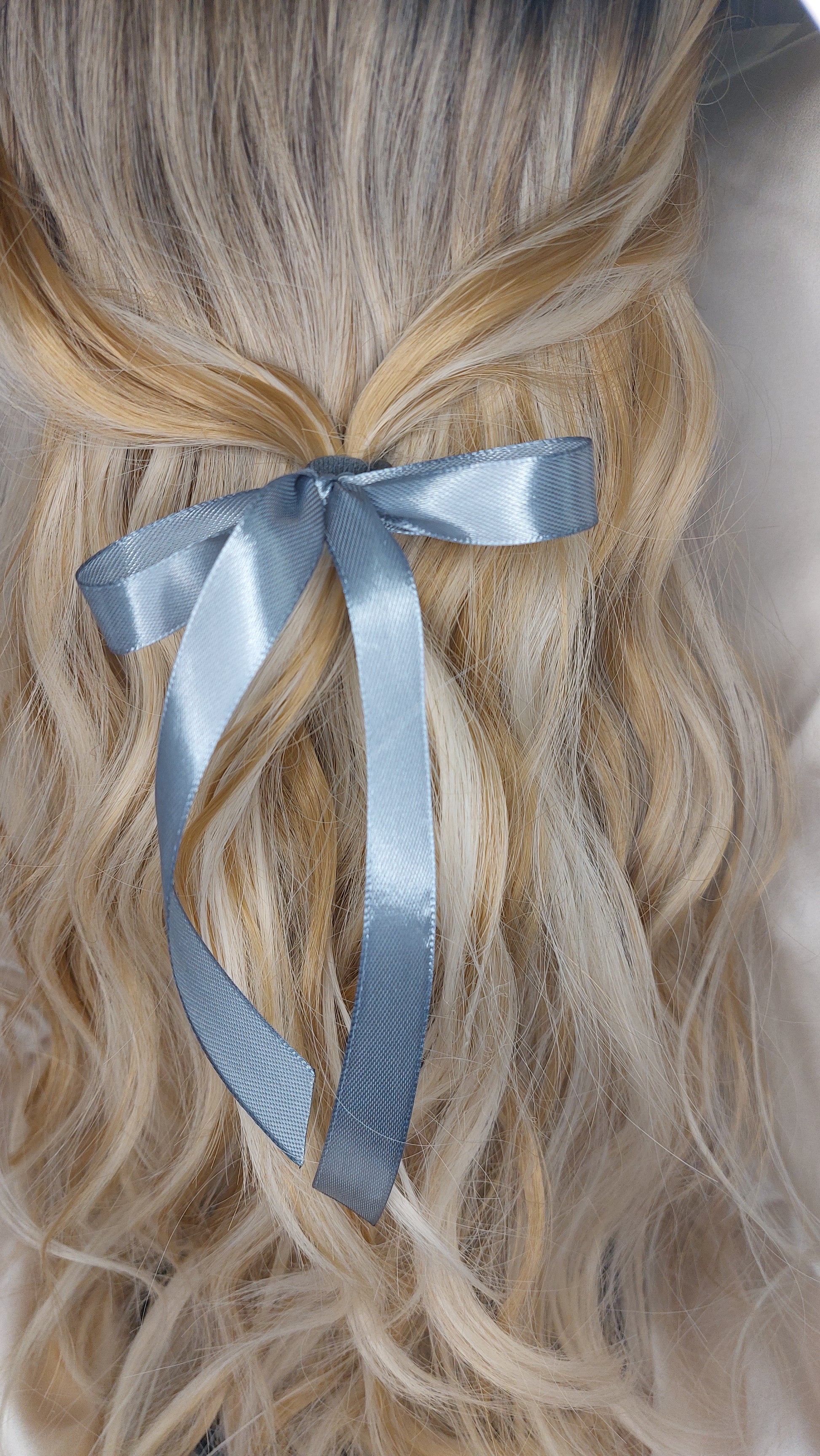Supersöt hårdekoration till både vardag som fest, stor som liten. Passar till alla från tjockt till tunt hår. Rosetten är ca 11cm bred och hänger ned ca 20cm. Tips! Om du vill ha kortare ändar på rosetten kan du enkelt klippa dem och bränna kanten (men bara snabbt och lite i taget!) så repar bandet inte upp sig.