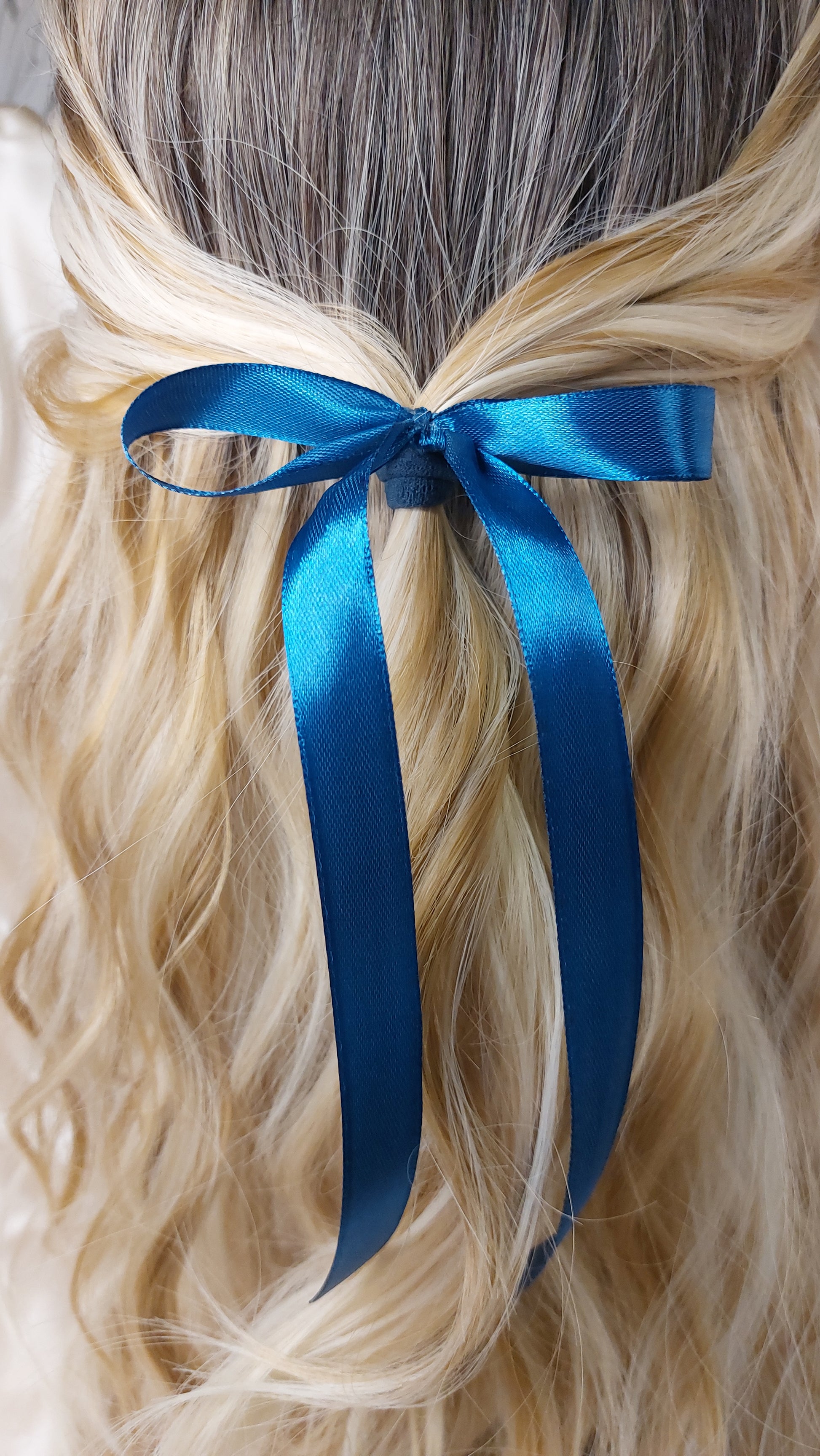 Supersöt hårdekoration till både vardag som fest, stor som liten. Passar till alla från tjockt till tunt hår. Rosetten är ca 11cm bred och hänger ned ca 20cm. Tips! Om du vill ha kortare ändar på rosetten kan du enkelt klippa dem och bränna kanten (men bara snabbt och lite i taget!) så repar bandet inte upp sig. Om du är barn: Bränn inte kanten utan målsmans sällskap!