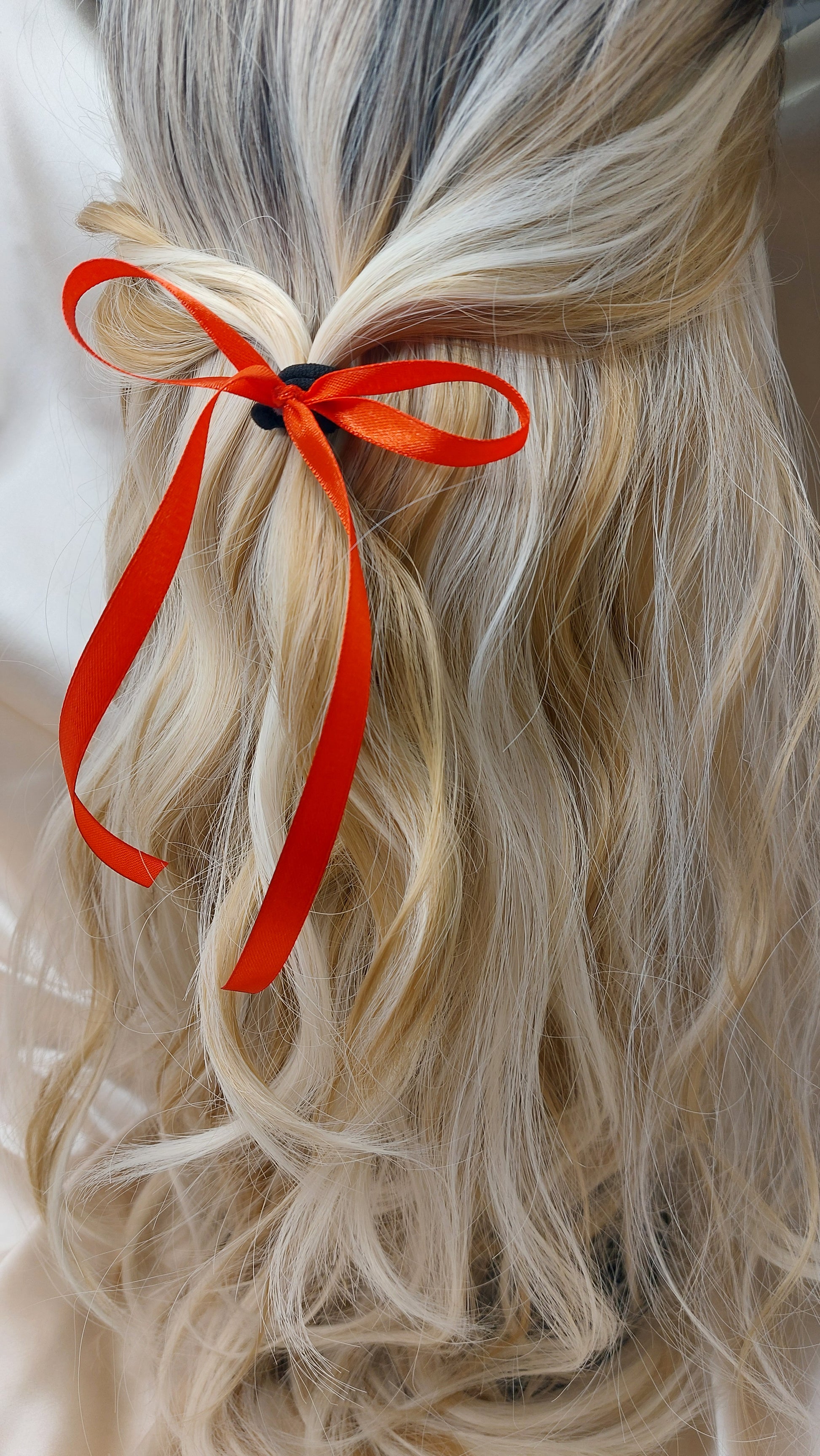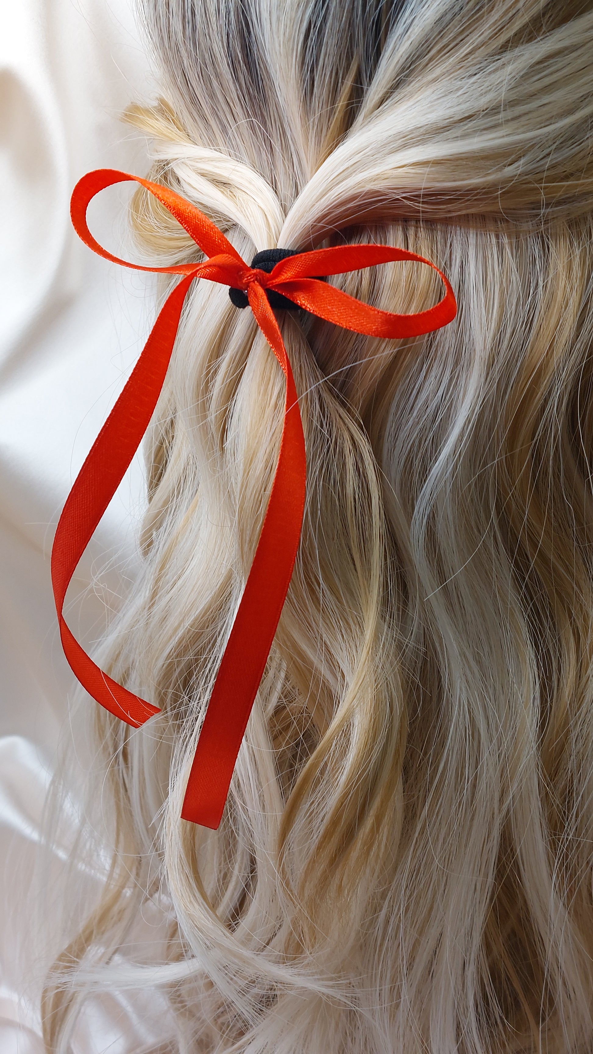 Supersöt hårdekoration till både vardag som fest, stor som liten. Passar till alla från tjockt till tunt hår. Rosetten är ca 11cm bred och hänger ned ca 20cm. Tips! Om du vill ha kortare ändar på rosetten kan du enkelt klippa dem och bränna kanten (men bara snabbt och lite i taget!) så repar bandet inte upp sig. Om du är barn: Bränn inte kanten utan målsmans sällskap!
