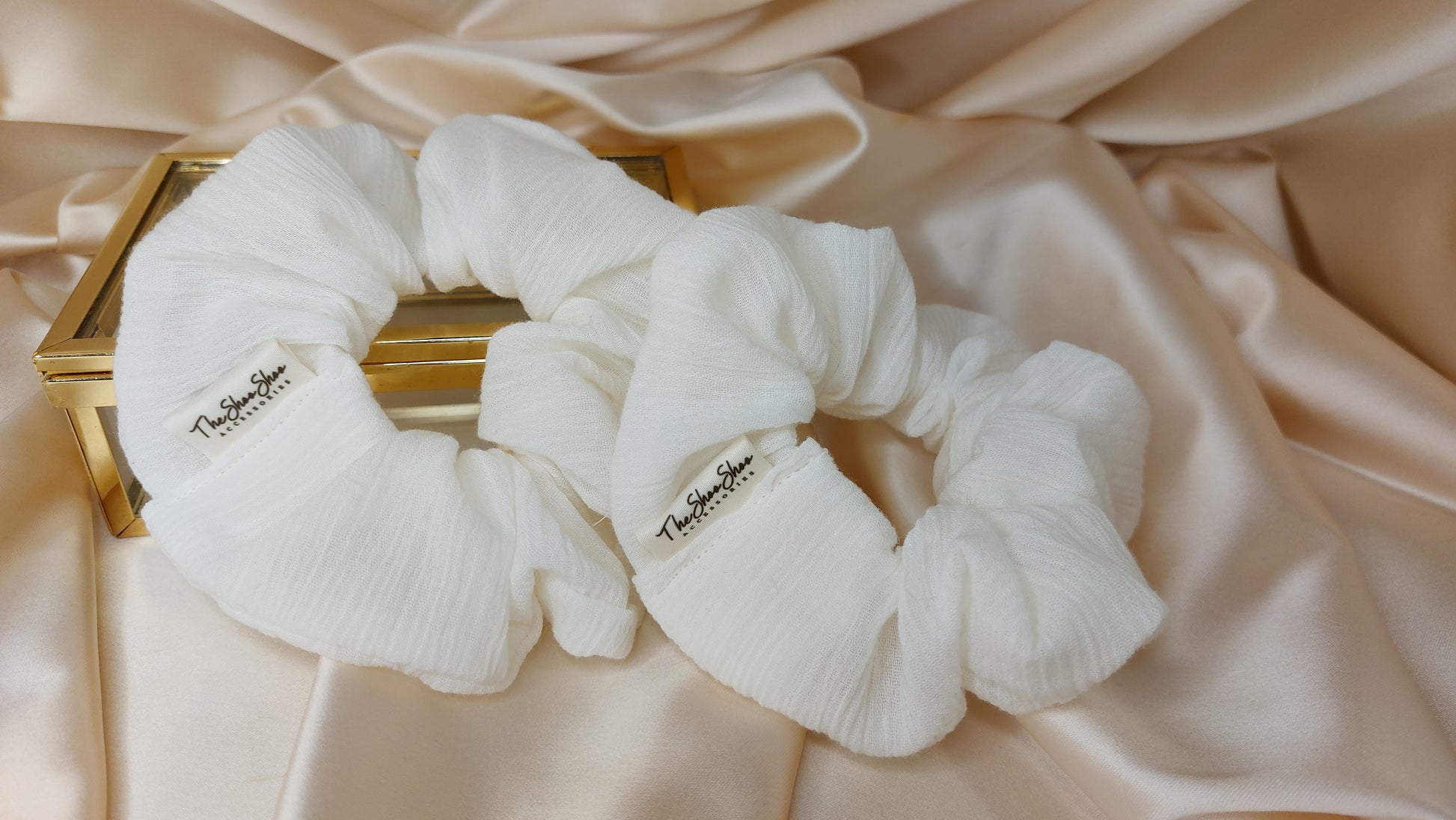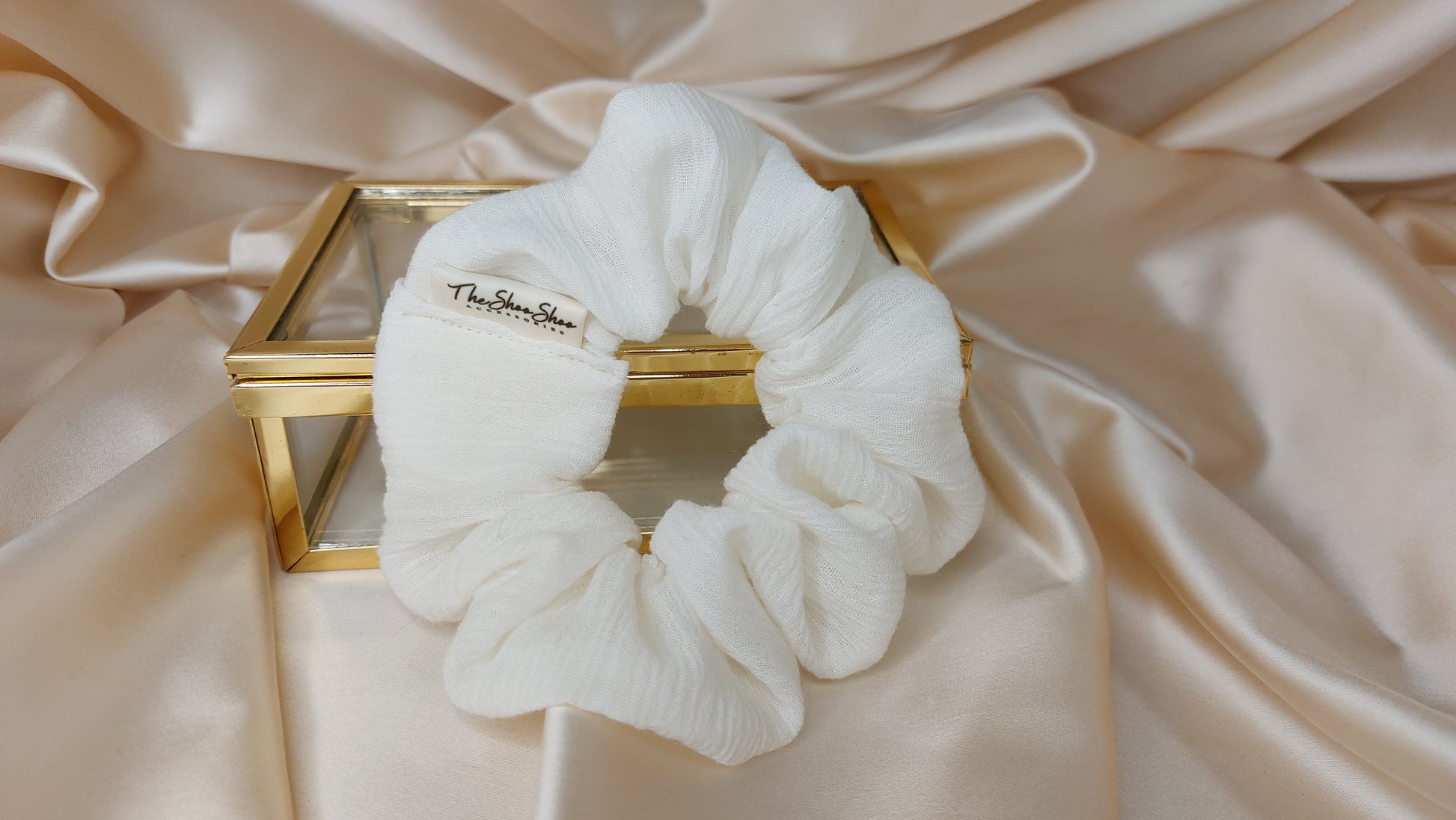 Alla Shoo Shoo scrunchies är klippta och sydda för hand. Det platta elastiska gummibandet inuti har knutits för hand. Passformen på ShooShoo-scrunchies gummiband görs större än på vanliga scrunchies för att passa bättre på handleden utan att strama åt, men också för att hålla alla sorters hår bättre.