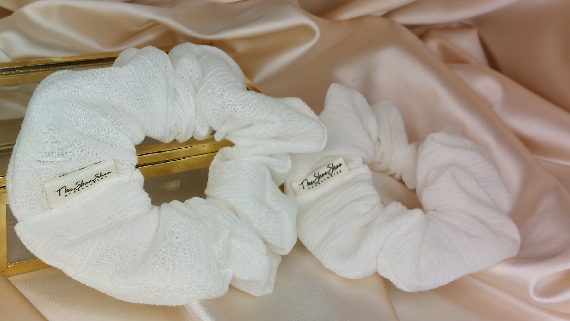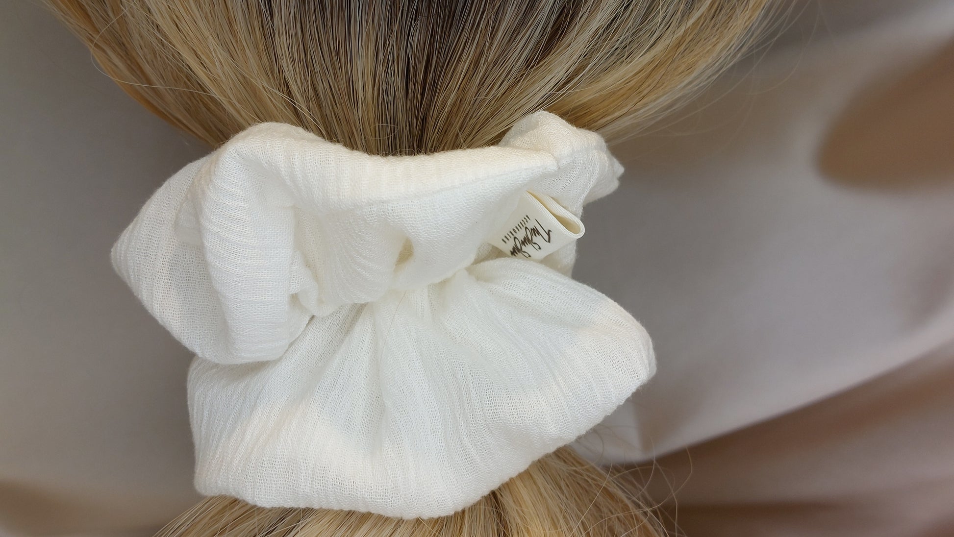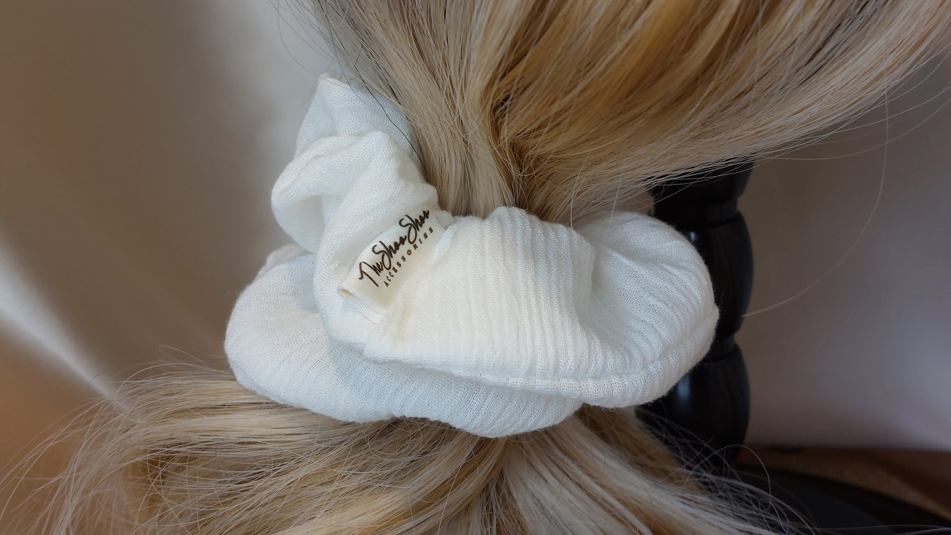 The Shoo Shoo hårsnodd av bomull med fin ribbad struktur i vackert vitt. Mjukt tyg av hög kvalitet inhandlat från lokala tygbutiker. Passar till alla från tjockt till tunt hår.